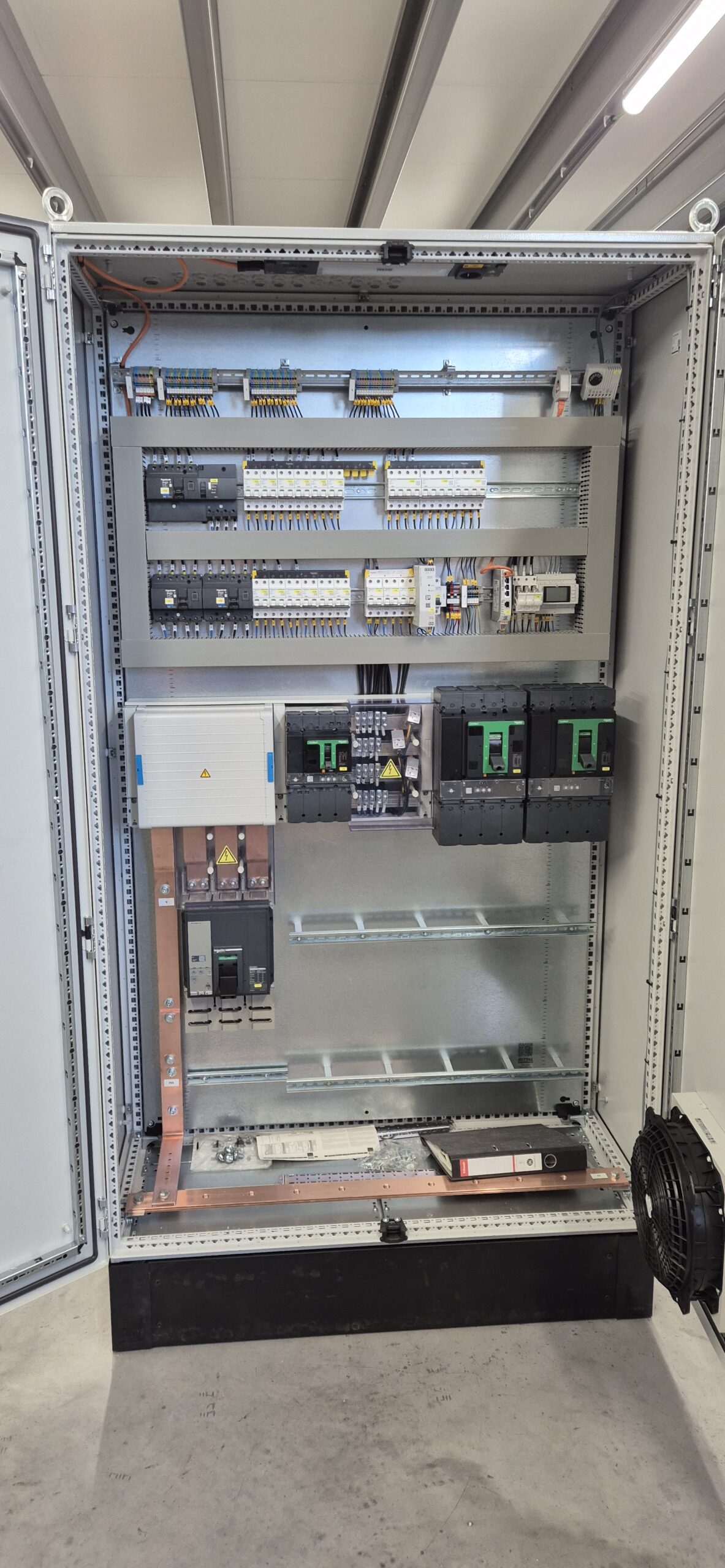 • een algemeen laagspanningsbord 3×400 V TNC S met vertrekken voor EV fastchargers en de overkoppeling van de bestaande elektrische installatie van de klant